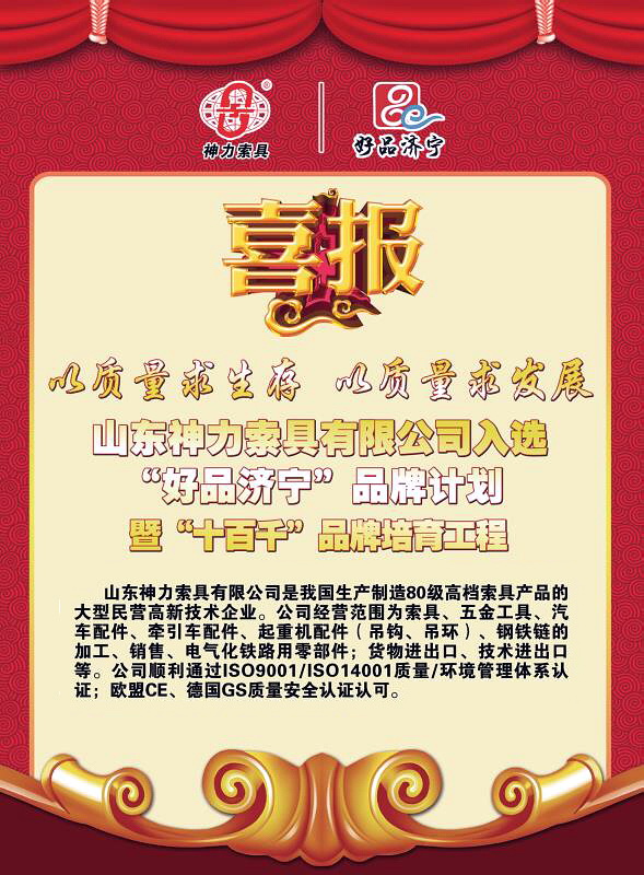 神力索具產(chǎn)品被機(jī)械電子工業(yè)部評(píng)定為優(yōu)質(zhì)產(chǎn)品,被國(guó)家經(jīng)貿(mào)委認(rèn)定為國(guó)家級(jí)新產(chǎn)品,并榮獲“九五”國(guó)家技術(shù)創(chuàng)新優(yōu)秀項(xiàng)目獎(jiǎng)、“最具市場(chǎng)競(jìng)爭(zhēng)力品牌”、“中國(guó)索具行業(yè)50強(qiáng)企業(yè)”、“山東名牌”、“山東省著名商標(biāo)”、“中國(guó)出口名牌”“山東省高新技術(shù)企業(yè)”“山東省索具工程技術(shù)中心”、“中國(guó)馳名商標(biāo)”等稱號(hào)。神力索具先后榮獲全國(guó)輕工業(yè)系統(tǒng)先進(jìn)集體、中國(guó)輕工業(yè)思想政治工作優(yōu)秀企業(yè)、中國(guó)專利山東明星企業(yè)、中國(guó)鍛壓協(xié)會(huì)工作先進(jìn)單位、山東省“十五”期間機(jī)電產(chǎn)品出口先進(jìn)企業(yè)、山東省現(xiàn)場(chǎng)管理樣板企業(yè)、山東省企業(yè)文化建設(shè)示范單位、山東省技術(shù)創(chuàng)新示范企業(yè)、山東省節(jié)能示范企業(yè)、山東省機(jī)械行業(yè)文明單位、山東省百?gòu)?qiáng)民營(yíng)企業(yè)、連續(xù)三年濟(jì)寧百?gòu)?qiáng)民營(yíng)企業(yè)等多項(xiàng)榮譽(yù)稱號(hào)。