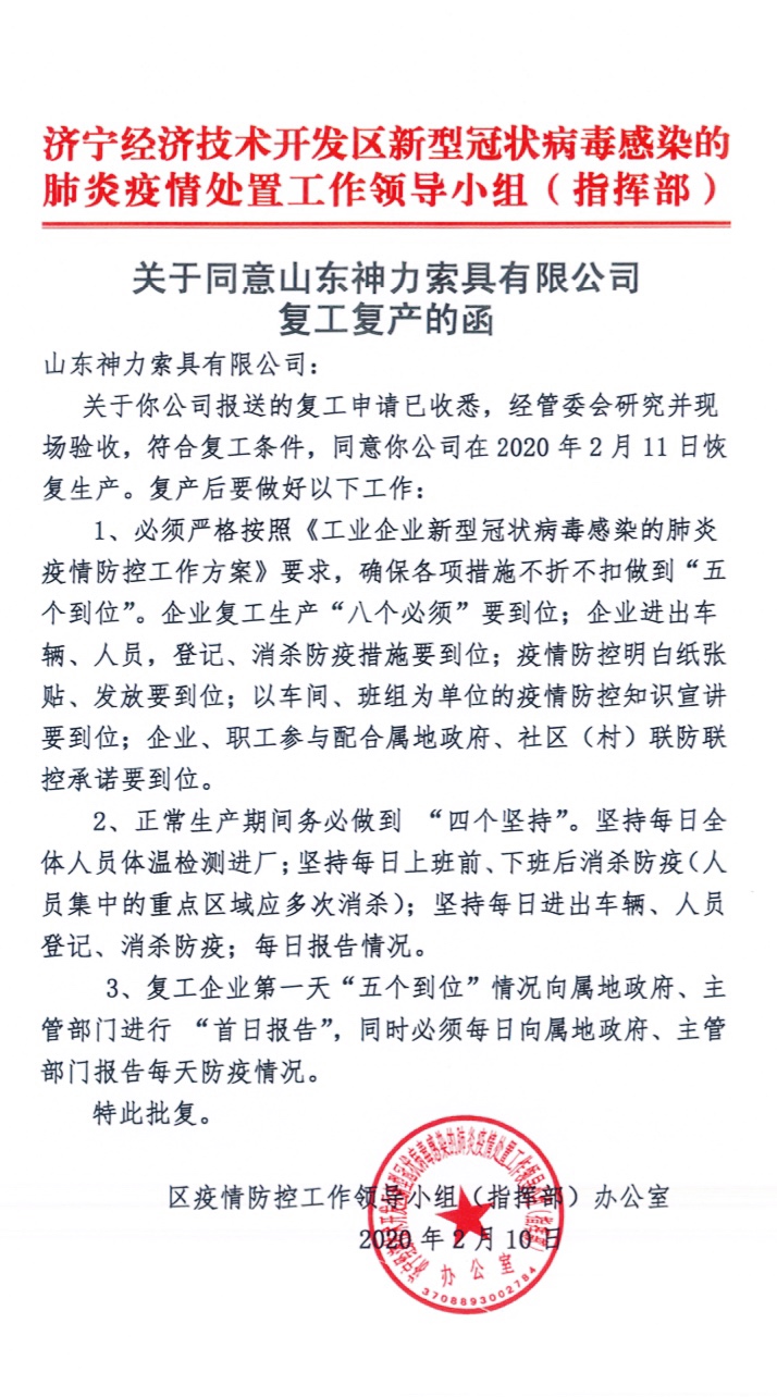 根據(jù)山東省對(duì)疫情防控的部署要求,我公司于2月11日正式復(fù)工。公司高層領(lǐng)導(dǎo)、各部門(mén)負(fù)責(zé)人、車(chē)間生產(chǎn)員工已到崗工作,歡迎您線上進(jìn)行產(chǎn)品、訂單的溝通和交流。期間,我們將嚴(yán)格按照防疫規(guī)定,做好每日疫情、人員信息統(tǒng)計(jì)排查、復(fù)工保障物資準(zhǔn)備及相關(guān)安排,確保全員安全、有序復(fù)工。